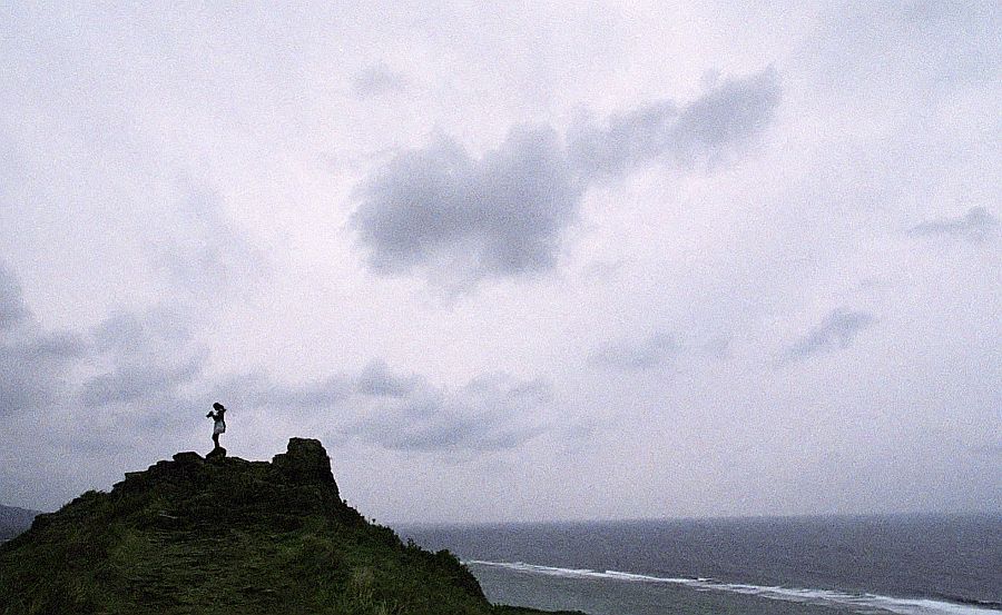 石垣島の北端の山の上。立ってるのは当時のうちのスタッフ。この頃は離島ばかり行っていた。