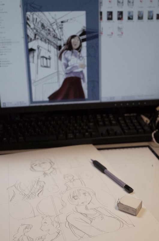 写真は「5時まで待てない」の下書きで奥のモニタのは「ふたりのおうち」2巻の表紙イメージ。