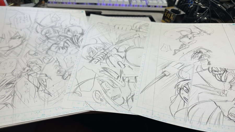 新鮮な気分で下書きも出来たが、いまはネーム書いて即座に原稿の下書き。