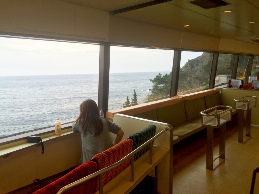 熱海からリゾート21という伊豆急行の普通電車に乗って南へ。写真のとおり窓が大きくて海を向いたシートがあったりする列車だ。レストランとかじゃないよ列車だよ。平日だからか客も少なくてガラガラ。追加料金なしでこれはいいなあ。たいしたもんだ伊豆急行。