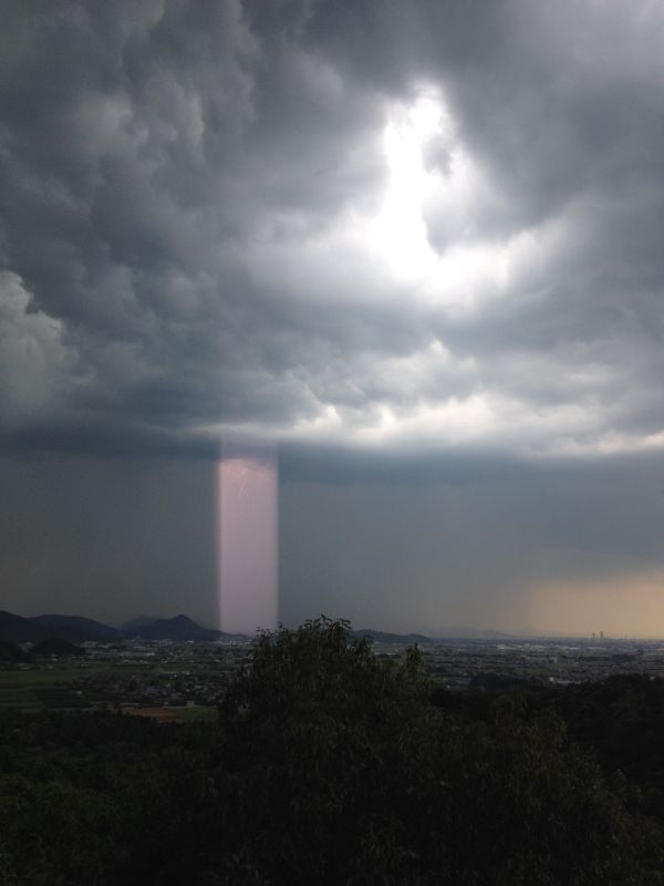 そして猛烈な雨とともに雷もやってきて、やがて僕のいた小さな東屋のすぐ後ろに地響きとともに落雷。いやあ光と爆音が同時に来る恐怖ったらないな。その東屋のすぐ後ろには、数メートルほどの高さの とある不思議な巨大像があって、その頭のあたりに避雷針があるせいでそこをめがけて落ちる訳なんだけど。